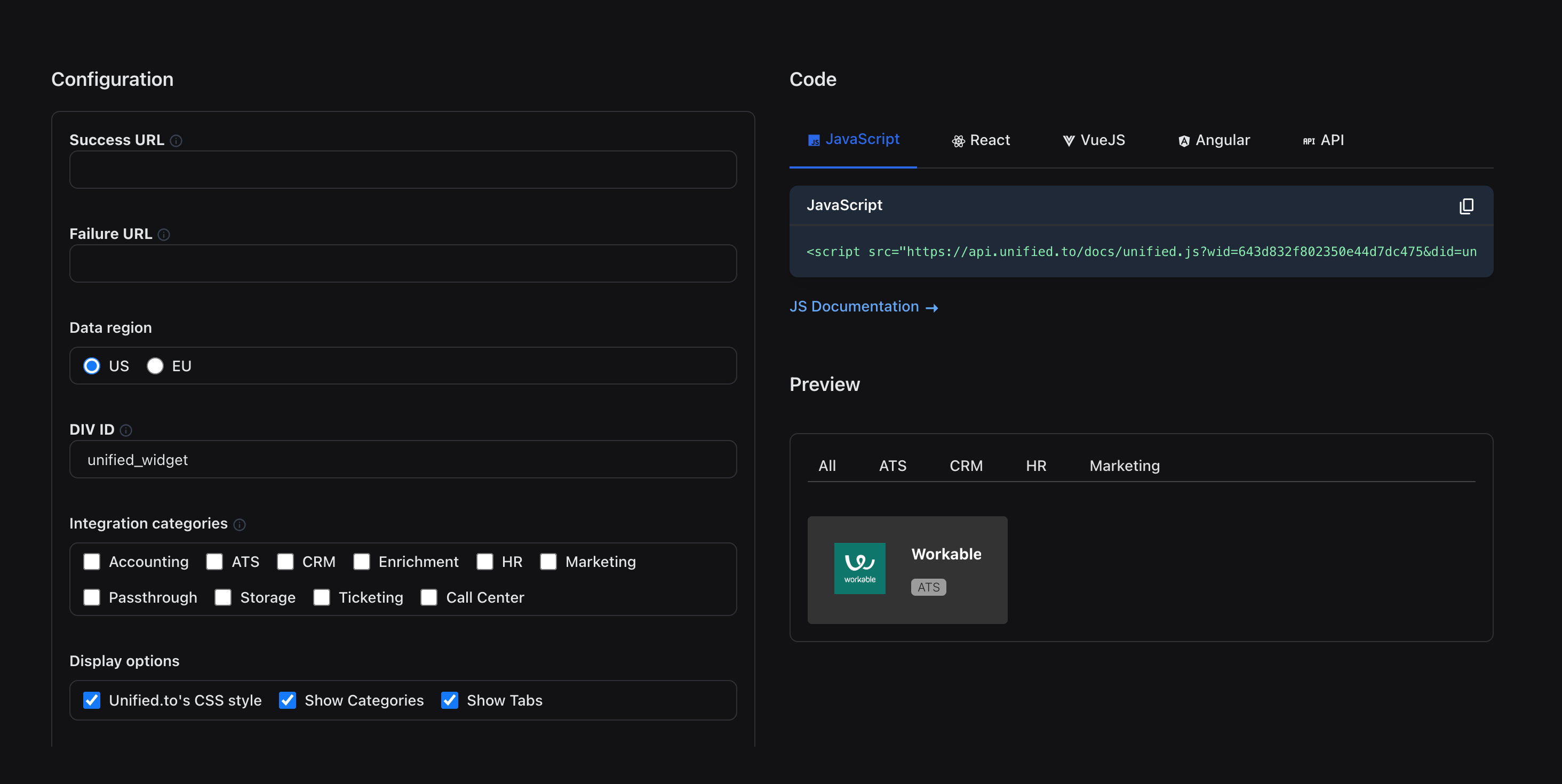 Once you've created your Unified.to account and completed onboarding, you can activate Workable and any other integrations you'd like to add to your app. Activation refers to the process of enabling and configuring an integration.
