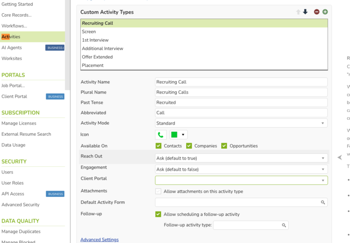 - Critical: By default, Activity Types are set to no records and must be configured or they'll be unavailable for use