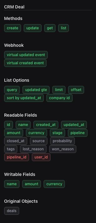 For example, this is the Feature Support list for CRM Deals by ActiveCampaign: