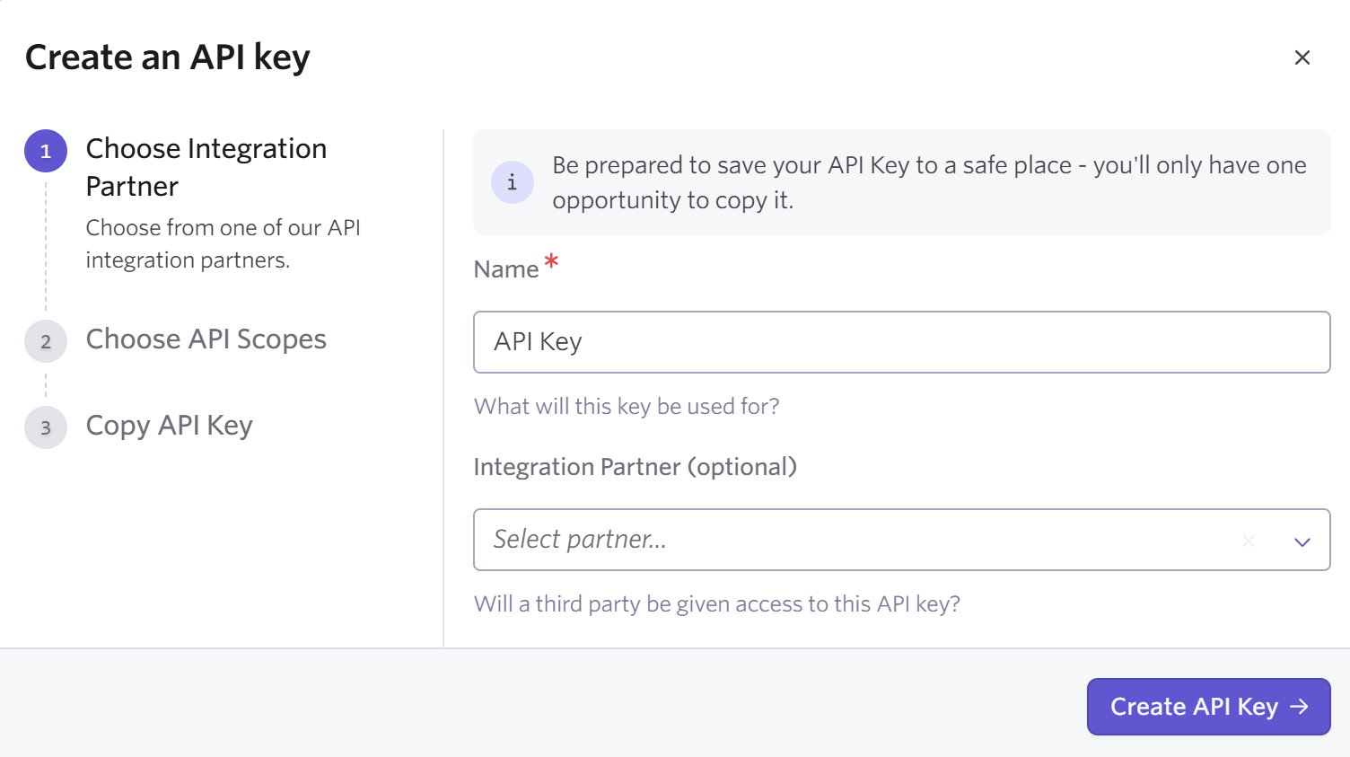 - Add a name for the new API Key, click Create API Key