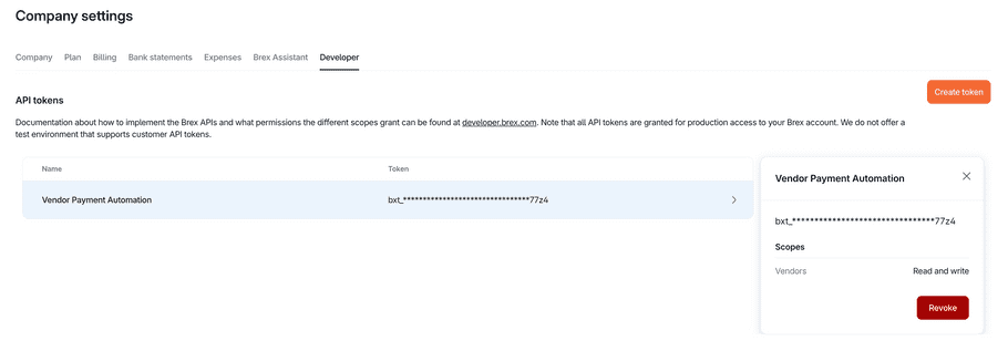 - Back on the developer page of your Brex dashboard, you should see your token listed now. As a security measure, part of the string is obfuscated. If you lose it, create a new one and replace the token.