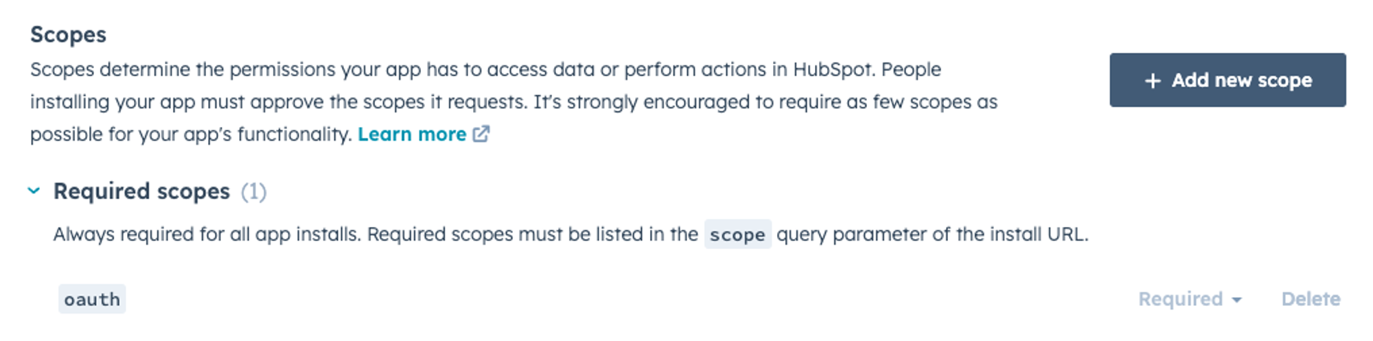 For apps created before April 2024, the oauth scope may be missing from your app's auth settings. Apps created after this date have it on by default. This scope is required for the HubSpot integration to work.