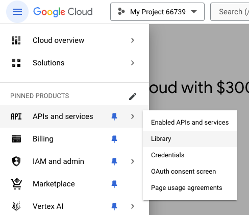 - Once the project is selected or created, open the left sidebar and then navigate to APIs and services > Library