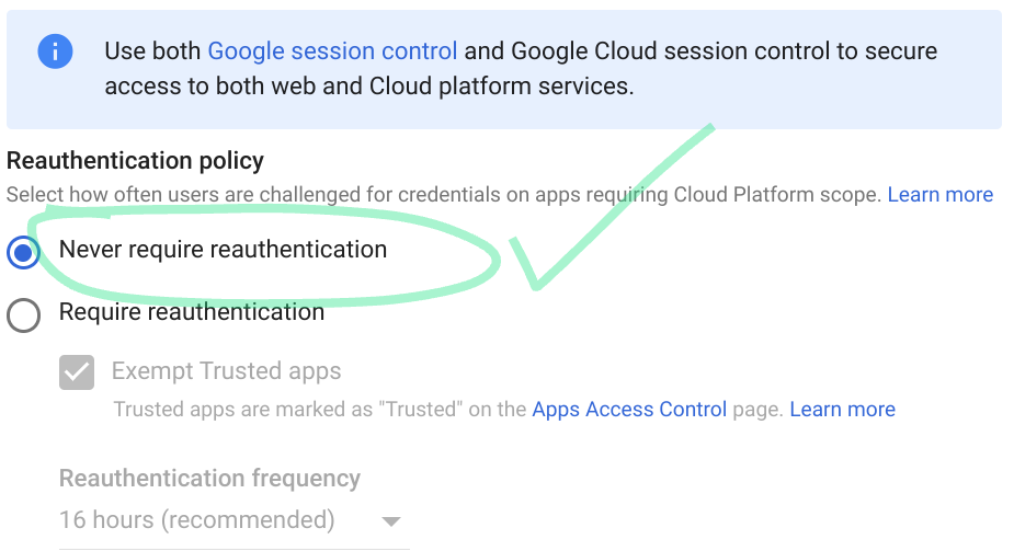 - In the Google Workspace Admin Console, navigate to Menu > Security > Access and data control > Google Cloud session control.