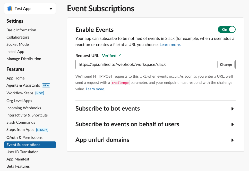 This guide explains how to configure your Slack app's event subscriptions to work with Unified.to webhooks. This is a required step before you can create webhooks that listen for Slack events. Once configured, your webhooks will receive real-time notifications when specific events occur in your Slack workspace, such as when users send messages.