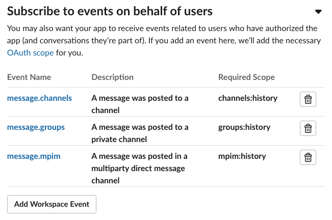 message.groups(under user) - The other events you can subscribe to are the ones that fall under the following scopes under Subscribe to events on behalf of users:
