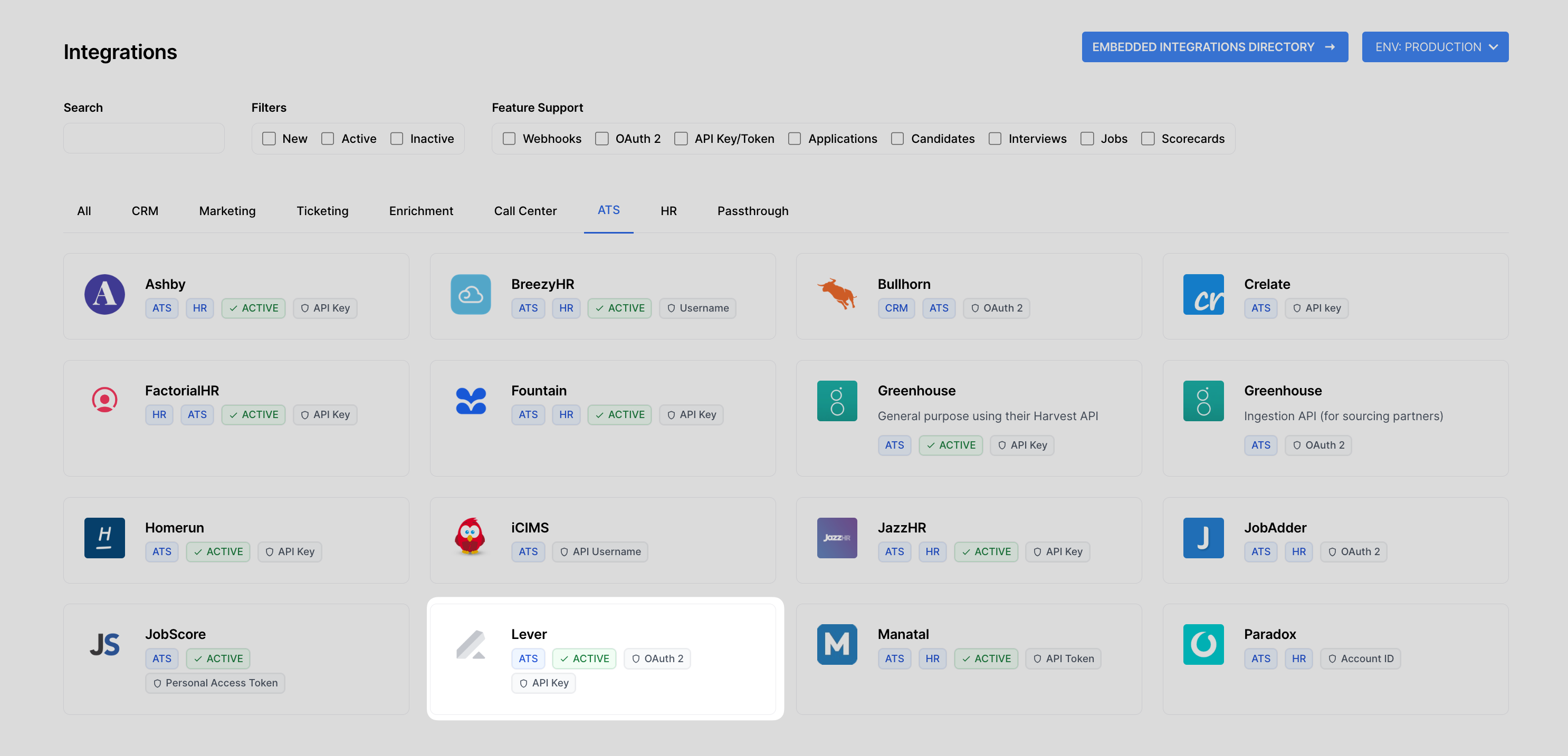 You can use the search bar, filter by app categories like "HR" and "ATS" or view all of our available integrations at once. The integrations you activate are the ones you intend to enable for user authorization.
