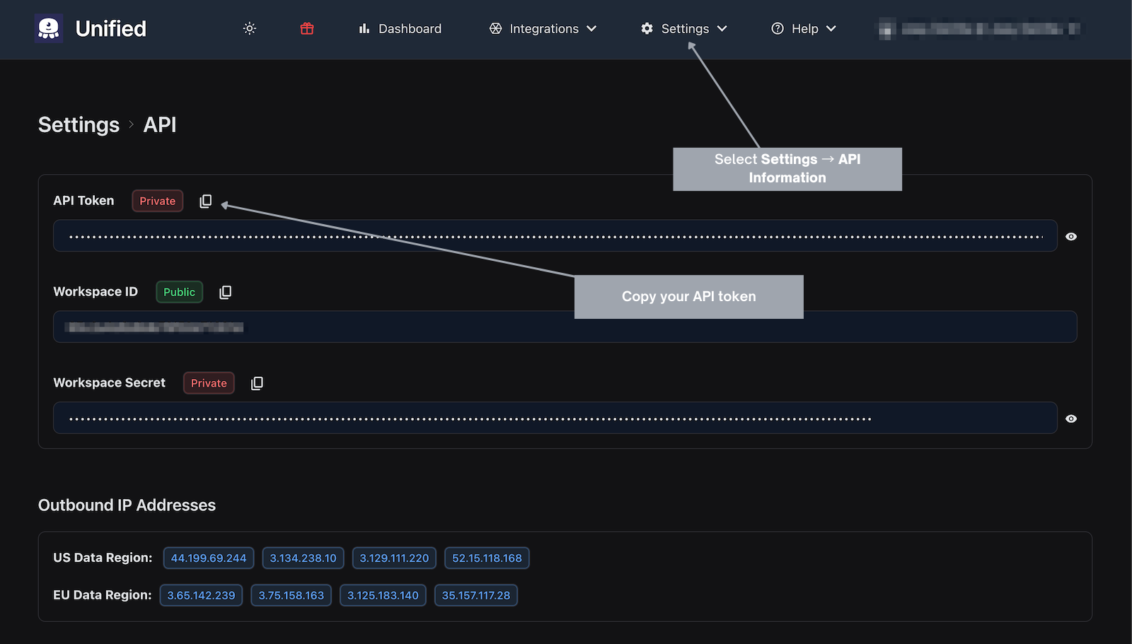 In order to access the Unified.to API, you need the Unified.to API token for your account. You can copy this value from the API Information page, which you can navigate to by selecting Settings → API Information from the Unified.to menu bar: