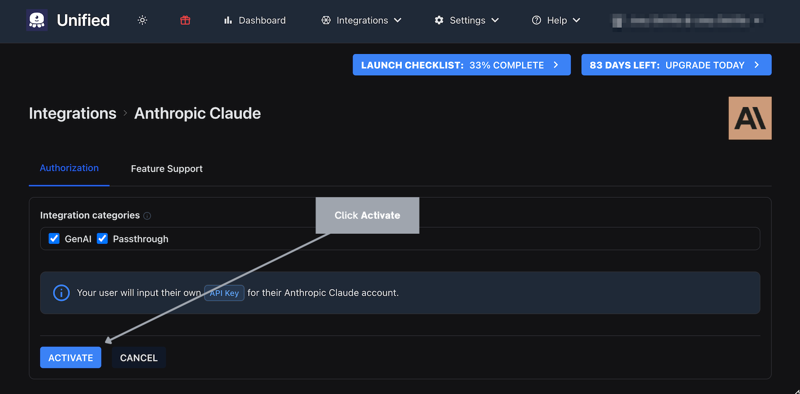 Activate the Claude integration by clicking the ACTIVATE button. This will return you to the Integrations page, where you'll see that the Anthropic Claude item is now marked "active:"