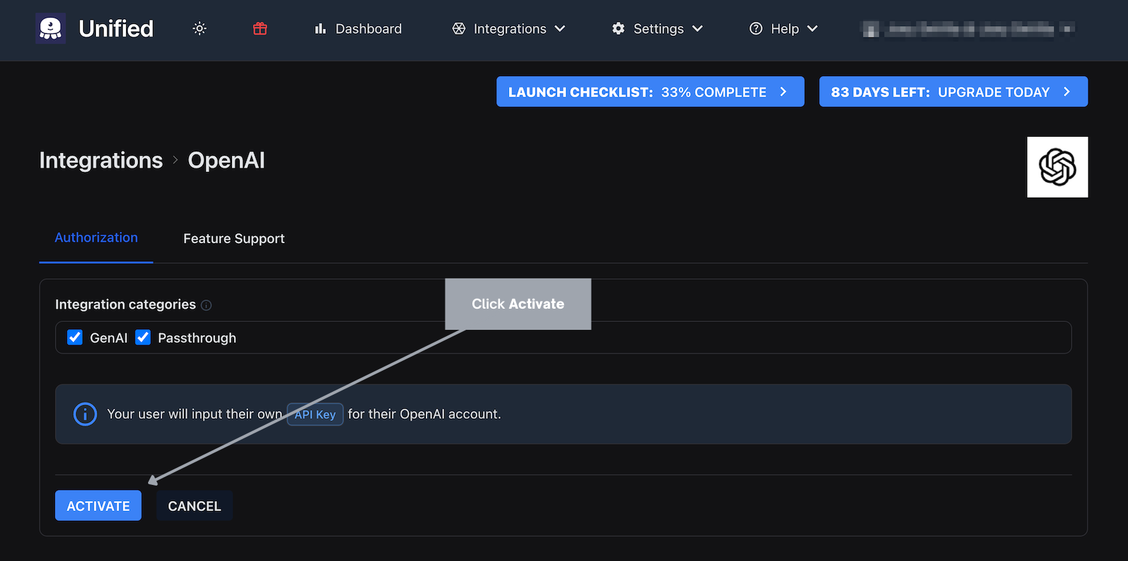 Activate the OpenAI integration by clicking the ACTIVATE button. Once again, you'll return to the Integrations page, where you'll see that the OpenAI item is also marked "active:"