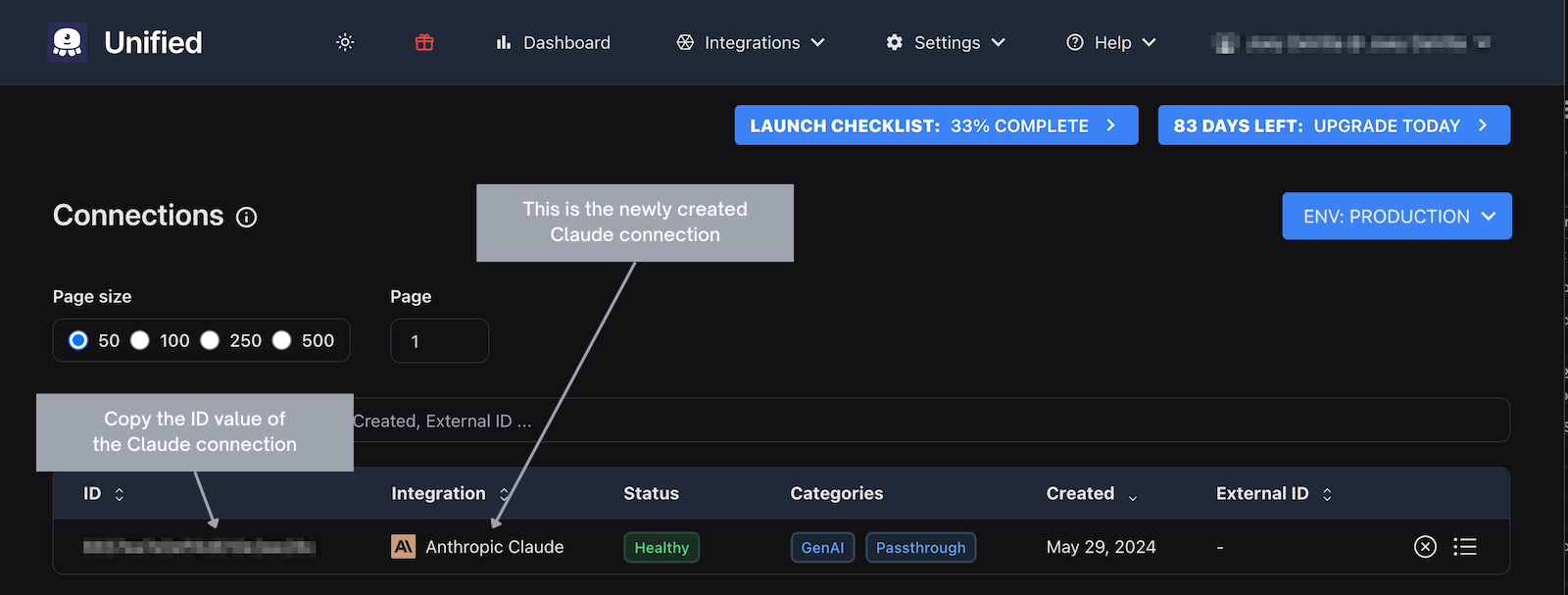 Copy the ID value for the Claude connection you just created; you'll need it after creating the connections.